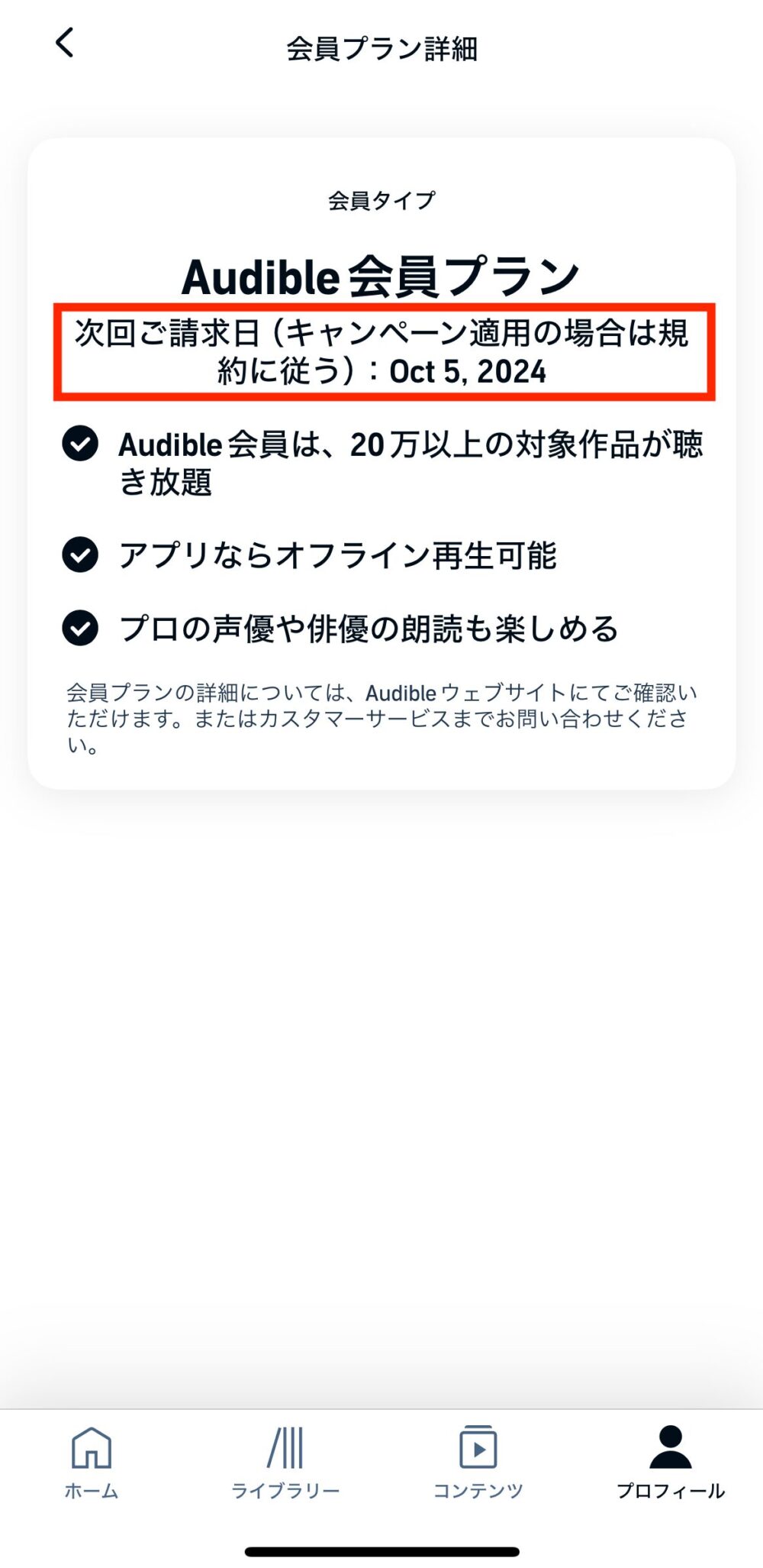 オーディブルの解約手続きが完了しても、更新日までは聴くことができます。