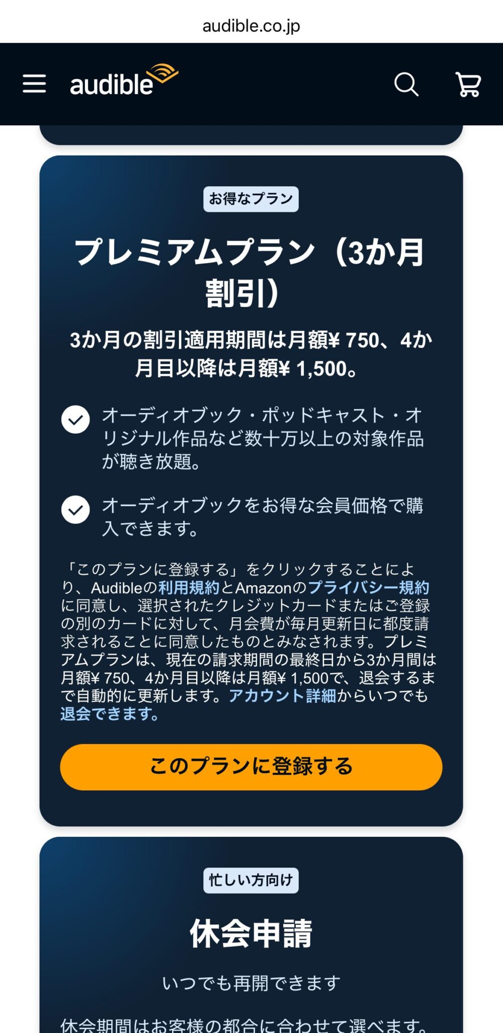休会できるのは、Audibleプレミアムプランの方のみ。