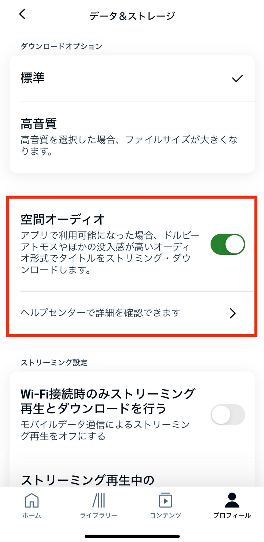 再度、「Wi-Fi接続時のみストリーミング再生とダウンロードを行う」をオンにすることを忘れないでください