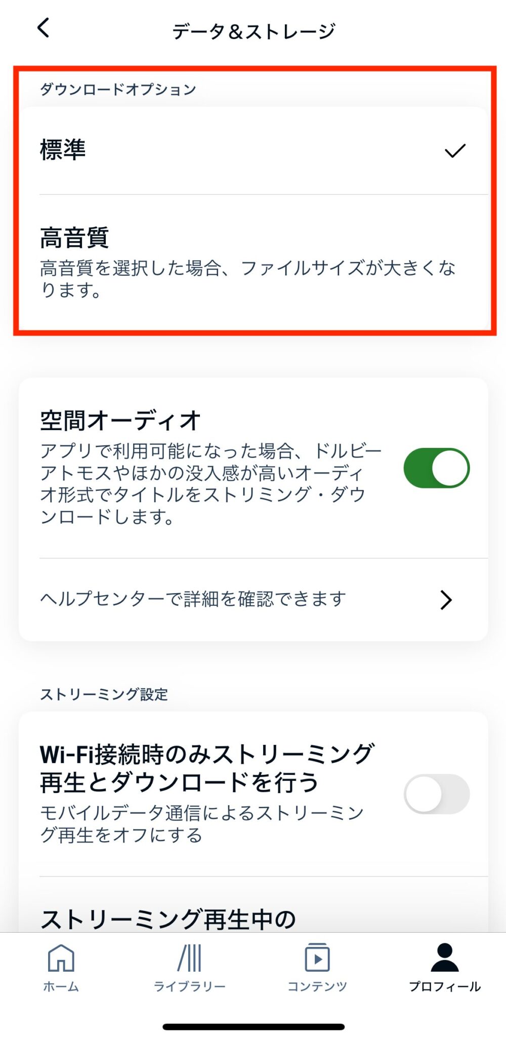 オーディブルの音質設定で「標準」と「高音質」を選べる項目があります。